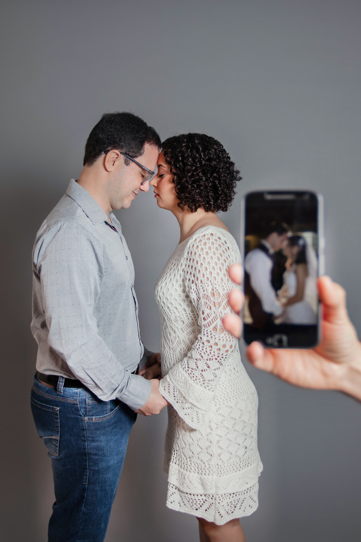 Ensaio casal em estúdio fotográfico para comemorar 10 anos de casados. Reprodução de fotos no celular quando casaram há 10 anos atrás. Em stúdio em Santo Antônio de Pádua no interior do Rio de Janeiro.